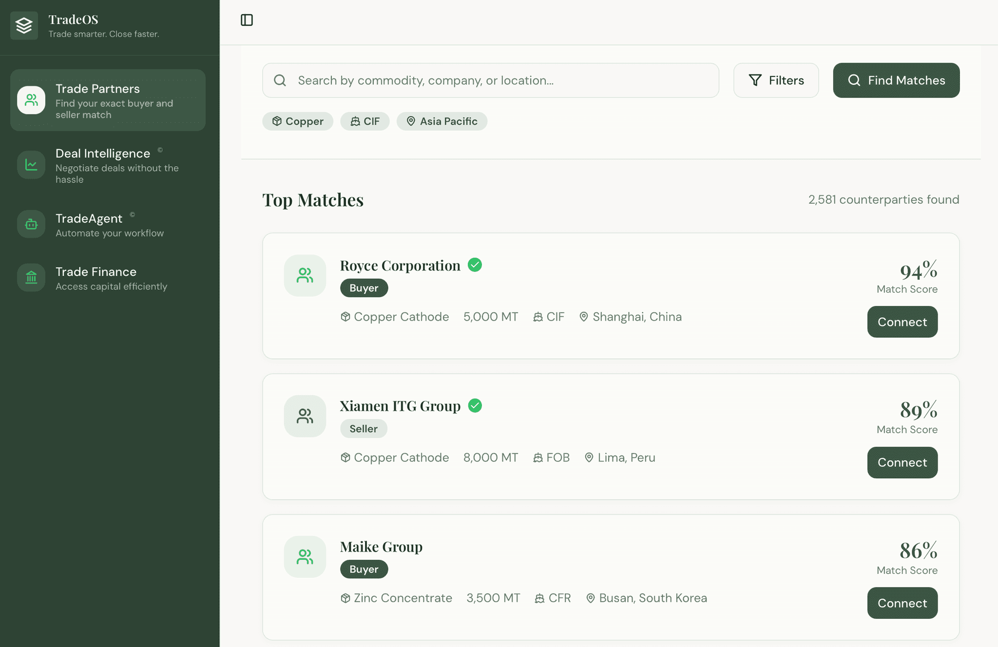 Match with vetted counterparty based on commodity specs, volumes, incoterms, and geography.